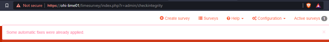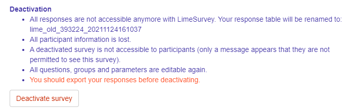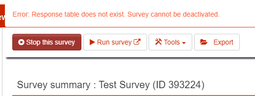 | Description | After deactivating an active survey, and attempting to visit the list of existing surveys, the following error is raised (see screenshot). I noticed this issue is fixed when visiting the data integrity page. There is a notification message saying some automatic changes were made. So it seems like a procedure that runs when first visiting the data integrity page needs to be run when clicking deactivate survey. | ||||