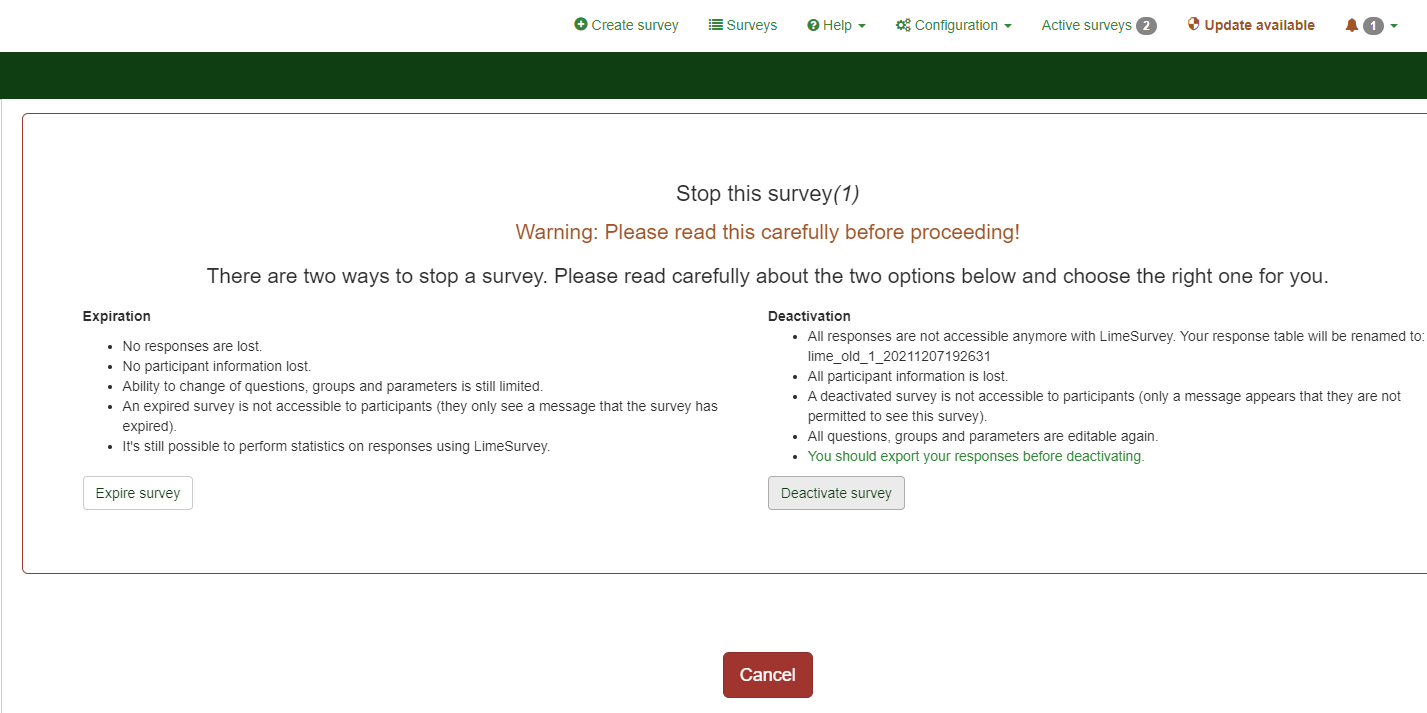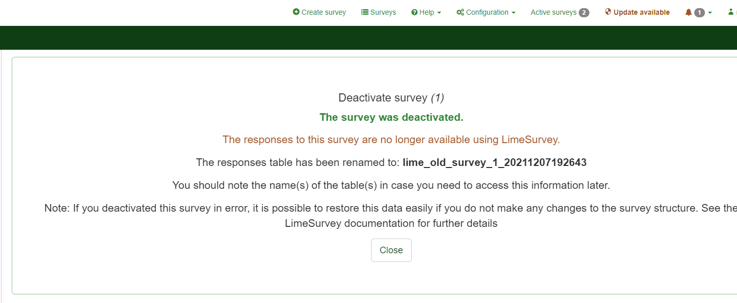 - You should be shown a warning about deactivating a survey. "Active surveys" is still 2, as expected. Click "Deactivate survey". See step_04.png