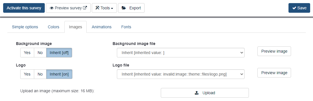 Expected resultTo display the selected logo and/or background image. Actual resultNo logo and/or no background image displayed. No values are saved in the Theme Options tab (on both global and survey levels). | ||||