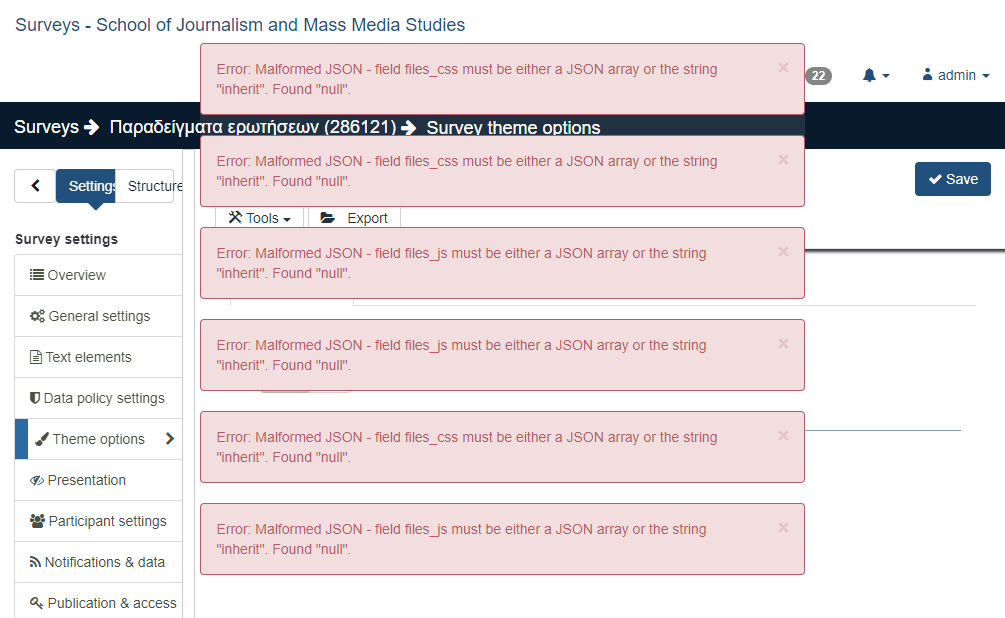 | Description | On the global, as well as on the survey Settings/Theme Options tab, the options for images (for both logo and background), are not saved correctly. When saving, in the template_configuration table, in the database, appears the following (notice the "invalid"): On the images tab (survey theme options), in the logo field appears the following (see screenshot1): As a result, no logo or background images appear, although defined, and in the nav_bar.twig, the "aSurveyInfo.options.brandlogofile" specification does work, unless the image file is explicitly specified as follows: Besides, when extending a theme, while trying to define the survey theme options for the first time, the following error message appears (see screenshot2): | ||||