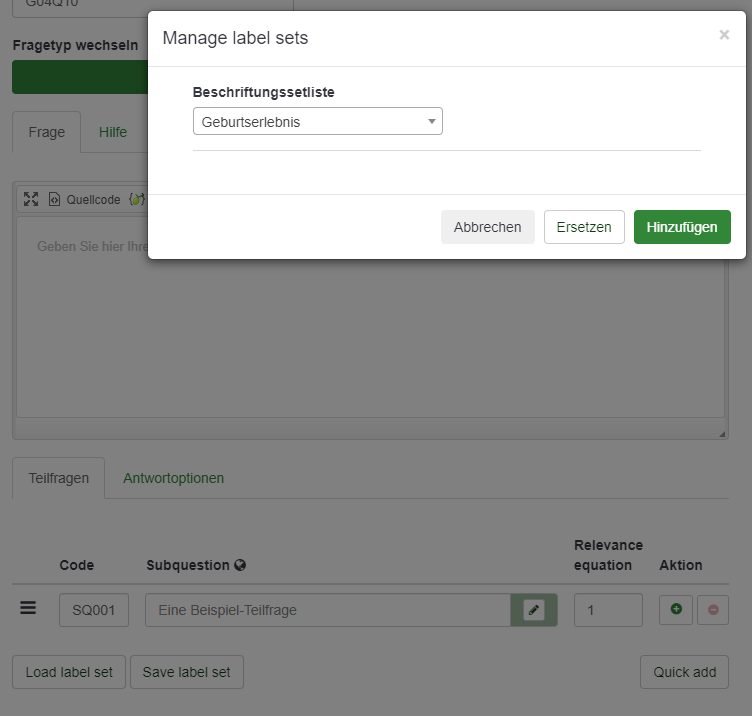 The answers previously saved under the label set just do not load when choosing the label set. And after Clicking on "Hinzufügen" (probably "add" in english) no additions are made in the subquestion list. |