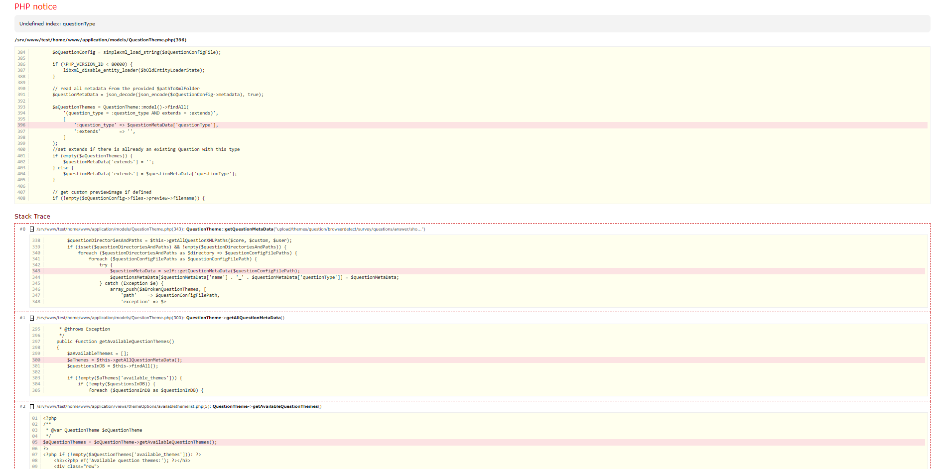| Description | After upgrading from LS 3 to LS 5, I get an error when I open "Configuration -> Themes -> Question Themes" and set it to "Type -> User Theme" and have the debug mode set to 1: Notice: Undefined index: questionType in /srv/www/test/home/www/application/models/QuestionTheme.php on line 396 Notice: Undefined index: questionType in /srv/www/test/home/www/application/models/QuestionTheme.php on line 438 Notice: Undefined index: questionType in /srv/www/test/home/www/application/models/QuestionTheme.php on line 344 Notice: Undefined index: questionType in /srv/www/test/home/www/application/models/QuestionTheme.php on line 396 Notice: Undefined index: questionType in /srv/www/test/home/www/application/models/QuestionTheme.php on line 344 Notice: Undefined index: questionType in /srv/www/test/home/www/application/models/QuestionTheme.php on line 396 Notice: Undefined index: questionType in /srv/www/test/home/www/application/models/QuestionTheme.php on line 344 Notice: Undefined index: questionType in /srv/www/test/home/www/application/models/QuestionTheme.php on line 396 Notice: Undefined index: questionType in /srv/www/test/home/www/application/models/QuestionTheme.php on line 438 Notice: Undefined index: questionType in /srv/www/test/home/www/application/models/QuestionTheme.php on line 344 Notice: Undefined index: questionType in /srv/www/test/home/www/application/models/QuestionTheme.php on line 396 Notice: Undefined index: questionType in /srv/www/test/home/www/application/models/QuestionTheme.php on line 438 Notice: Undefined index: questionType in /srv/www/test/home/www/application/models/QuestionTheme.php on line 344 Notice: Undefined index: questionType in /srv/www/test/home/www/application/models/QuestionTheme.php on line 396 Notice: Undefined index: questionType in /srv/www/test/home/www/application/models/QuestionTheme.php on line 438 Notice: Undefined index: questionType in /srv/www/test/home/www/application/models/QuestionTheme.php on line 344 Notice: Undefined index: questionType in /srv/www/test/home/www/application/models/QuestionTheme.php on line 396 Notice: Undefined index: questionType in /srv/www/test/home/www/application/models/QuestionTheme.php on line 438 Notice: Undefined index: questionType in /srv/www/test/home/www/application/models/QuestionTheme.php on line 344 Notice: Undefined index: title in /srv/www/test/home/www/application/models/QuestionTheme.php on line 722 Notice: Undefined index: type in /srv/www/test/home/www/application/models/QuestionTheme.php on line 734 Notice: Undefined index: questionType in /srv/www/test/home/www/application/models/QuestionTheme.php on line 735 Notice: Undefined index: type in /srv/www/test/home/www/application/models/QuestionTheme.php on line 734 Notice: Undefined index: questionType in /srv/www/test/home/www/application/models/QuestionTheme.php on line 735 Notice: Undefined index: title in /srv/www/test/home/www/application/models/QuestionTheme.php on line 722 Notice: Undefined index: type in /srv/www/test/home/www/application/models/QuestionTheme.php on line 734 Notice: Undefined index: questionType in /srv/www/test/home/www/application/models/QuestionTheme.php on line 735 Notice: Undefined index: title in /srv/www/test/home/www/application/models/QuestionTheme.php on line 722 Notice: Undefined index: type in /srv/www/test/home/www/application/models/QuestionTheme.php on line 734 Notice: Undefined index: questionType in /srv/www/test/home/www/application/models/QuestionTheme.php on line 735 Notice: Undefined index: title in /srv/www/test/home/www/application/models/QuestionTheme.php on line 722 Notice: Undefined index: type in /srv/www/test/home/www/application/models/QuestionTheme.php on line 734 Notice: Undefined index: questionType in /srv/www/test/home/www/application/models/QuestionTheme.php on line 735 Notice: Undefined index: title in /srv/www/test/home/www/application/models/QuestionTheme.php on line 722 Notice: Undefined index: type in /srv/www/test/home/www/application/models/QuestionTheme.php on line 734 Notice: Undefined index: questionType in /srv/www/test/home/www/application/models/QuestionTheme.php on line 735 When I set the DebugMode to 2, I get the following error message see screenshot. | ||||