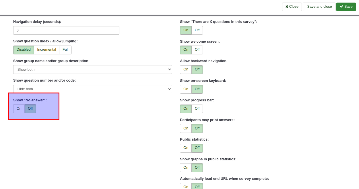 | Description | In the statistic display, no answer is still given as an option even if it is disabled in the global settings. Please see screenshots below | ||||