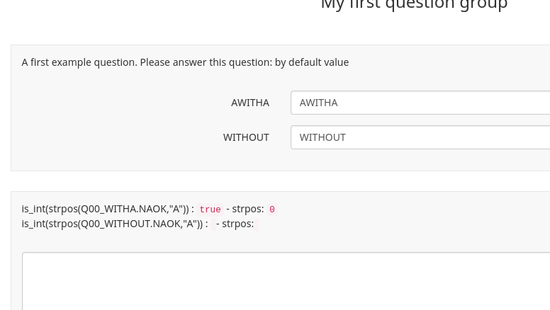 | Description | In PHP <?php if(is_int(strpos("a", "b"))) print "y"; else print "n"; ?>' outputs 'n', but in LimeSurvey {if(is_int(strpos("a", "b")), "y", "n")} gives 'y'. The problem is in is_int. not in strpos. That can be seen with x {strpos("a", "b")} y xx {strpos("a", "a")} yy. There is a workaround, to check if x contains y use strpos(join("#", x), y) > 0. | ||||