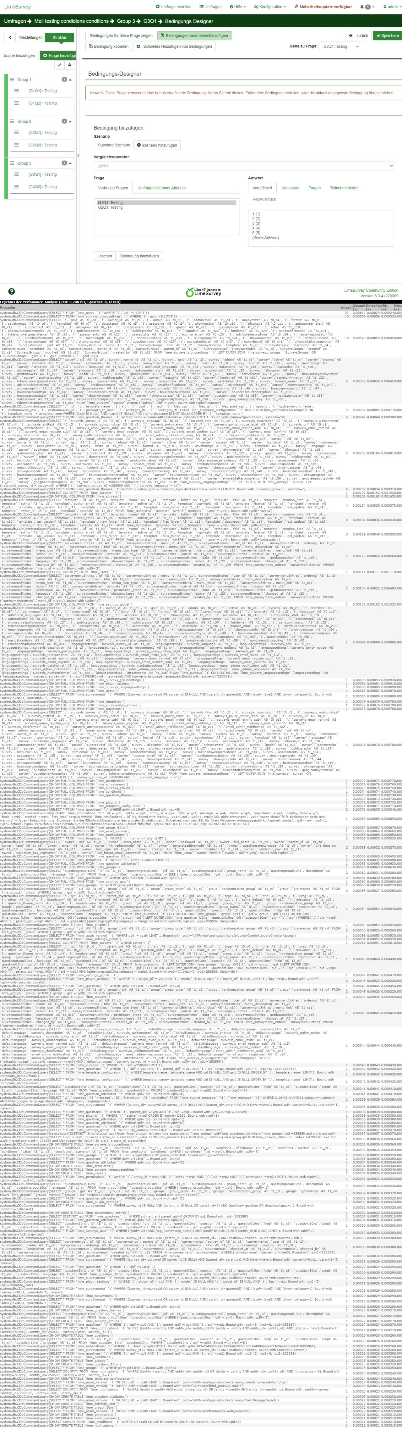 | Description | When adding conditions via the Conditions Designer, the correct questions are not displayed. The selection of the displayed questions under "previous questions" seems to be random and subsequent questions are also displayed, which should not be available for selection at all. The questions displayed there also do change randomly when you copy the survey and try to set new conditions. All questions are also automatically set to condition 1 and if you want to set new conditions, the following note is displayed in the backend: Concerns all surveys and questions in the system and occurred after updating our installation from 3.21.1 to 5.x Conditions that could be set correctly because the questions were randomly available for selection in the condition designer work. Setting conditions using ExpressionScript also works. Unfortunately, this is too difficult for regular users. Details attached (php configuration, screenshots incl. debug mode, lss/lsa file). | ||||