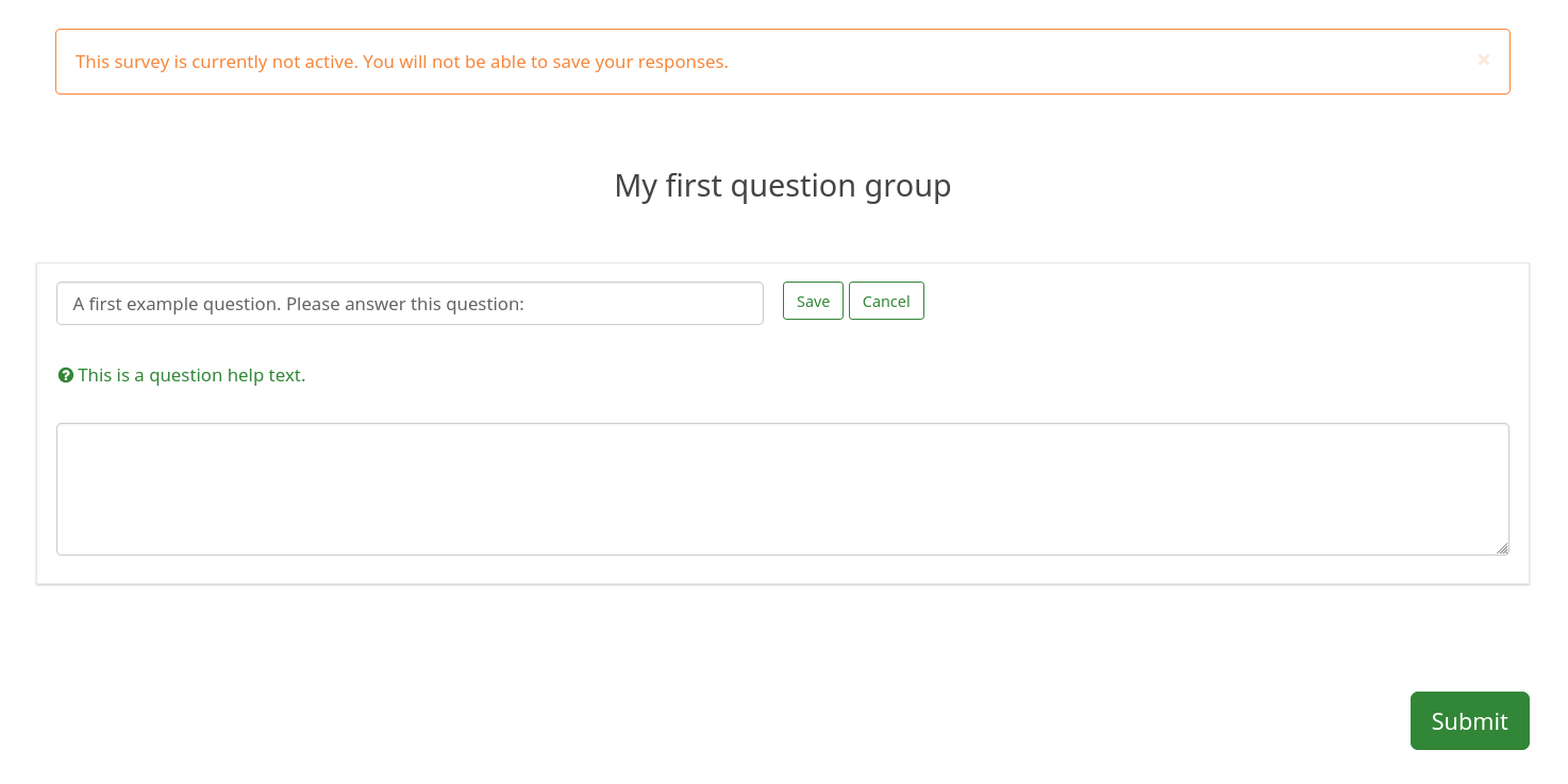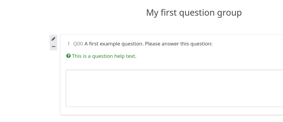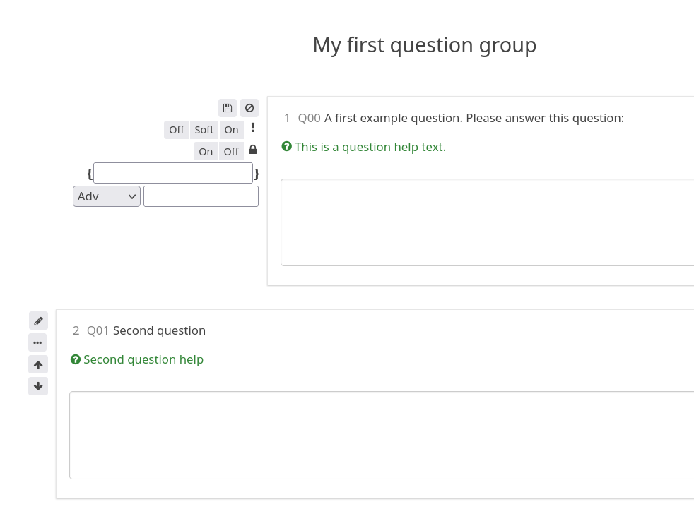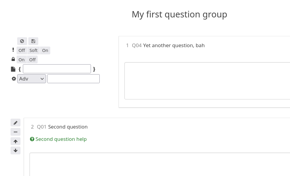 @tammo I have some tooltip. If you want, you can git checkout the branch, go to plugin manager, click "Scan files" and then install AND activate the EditInPlace plugin. Then click preview survey to test. Make sure to disable welcome page for the survey. "Adv" is a temporary, it will be populated with all non-basic question attributes. |
