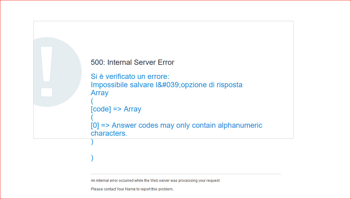 | Description | When entering a code with a dot in a answer option (Radio Button - (Type: L) ), the system recognises an error 500. | ||||