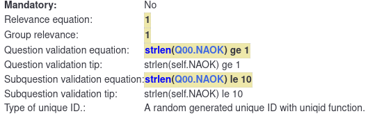 | Steps To Reproduce | Steps to reproduceImport included survey in 3.X : check strlen(self.NAOK) le 10 restriction Expected resultSubquestion validation equation still there Actual resultSubquestion validation equation dusappear. | ||||