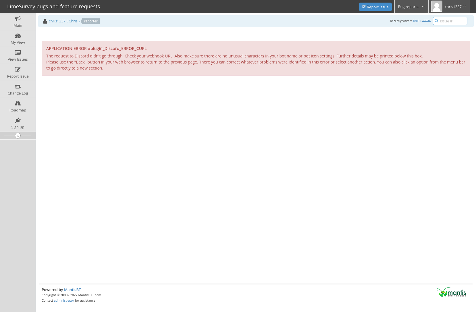 | Description | After submitting my last issue (https://bugs.limesurvey.org/view.php?id=18051) the bug tracker showed up an error message "APPLICATION ERROR #plugin_Discord_ERROR_CURL". | ||||