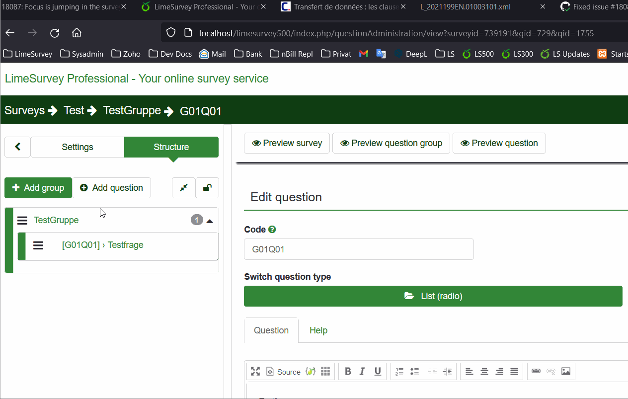 | Description | When working in the survey structure with several groups and clicking on the question in the first group, the visual focus of the question is vanishing one second after clicking and the group focus is moved to the next group. | ||||