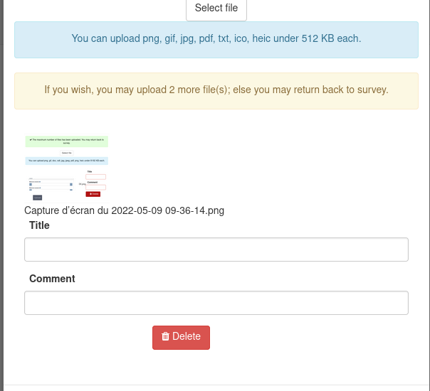 | 2022-05-09 09:45 | DenisChenu | File Added: limesurvey_survey_UploadFiles.lss | |