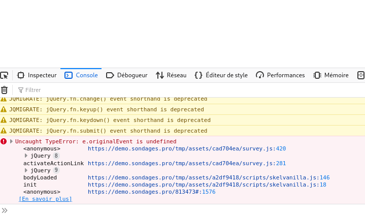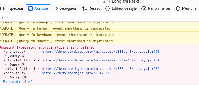 | Description | When click on "Resume later" at top link : get a JS error and nothing happen : survey is not saved. | ||||