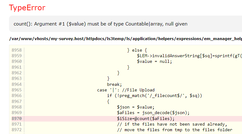 | Description | When running the attached survey and trying to clikc next on a page with a file upload question, I get this 500 server error: We had been using the same test survey for months so this issue must have been introduced within the next 4- weeks I'd say. 8958 } else { | ||||