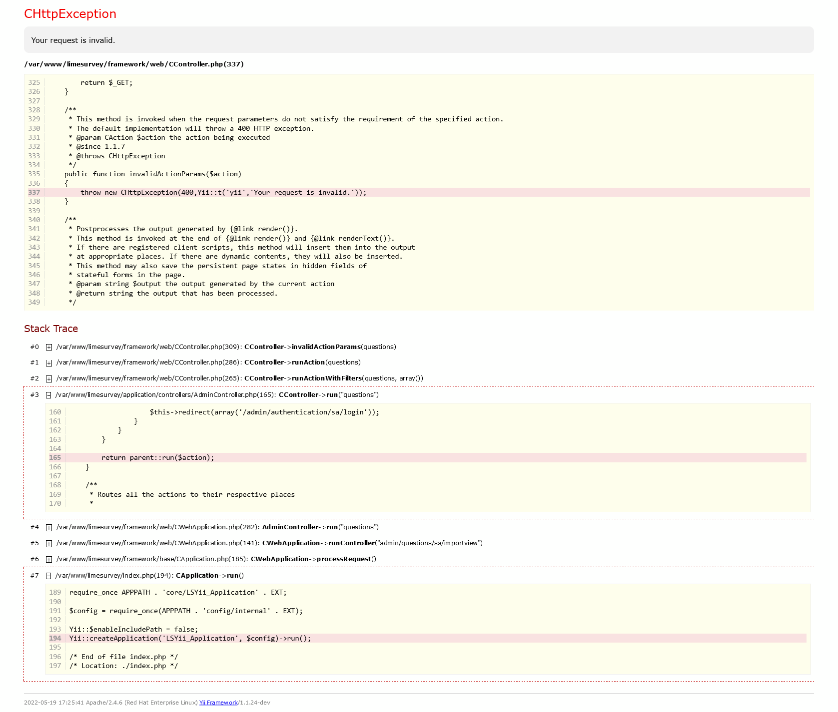 | Steps To Reproduce | Steps to reproducecreate a survey with example question group and question. Expected resultimport question interface shown Actual resultCHttpException Your request is invalid. /var/www/limesurvey/framework/web/CController.php(337) 325 return $_GET; Stack Trace 160 $this->redirect(array('/admin/authentication/sa/login')); #4 189 require_once APPPATH . 'core/LSYii_Application' . EXT; | ||||