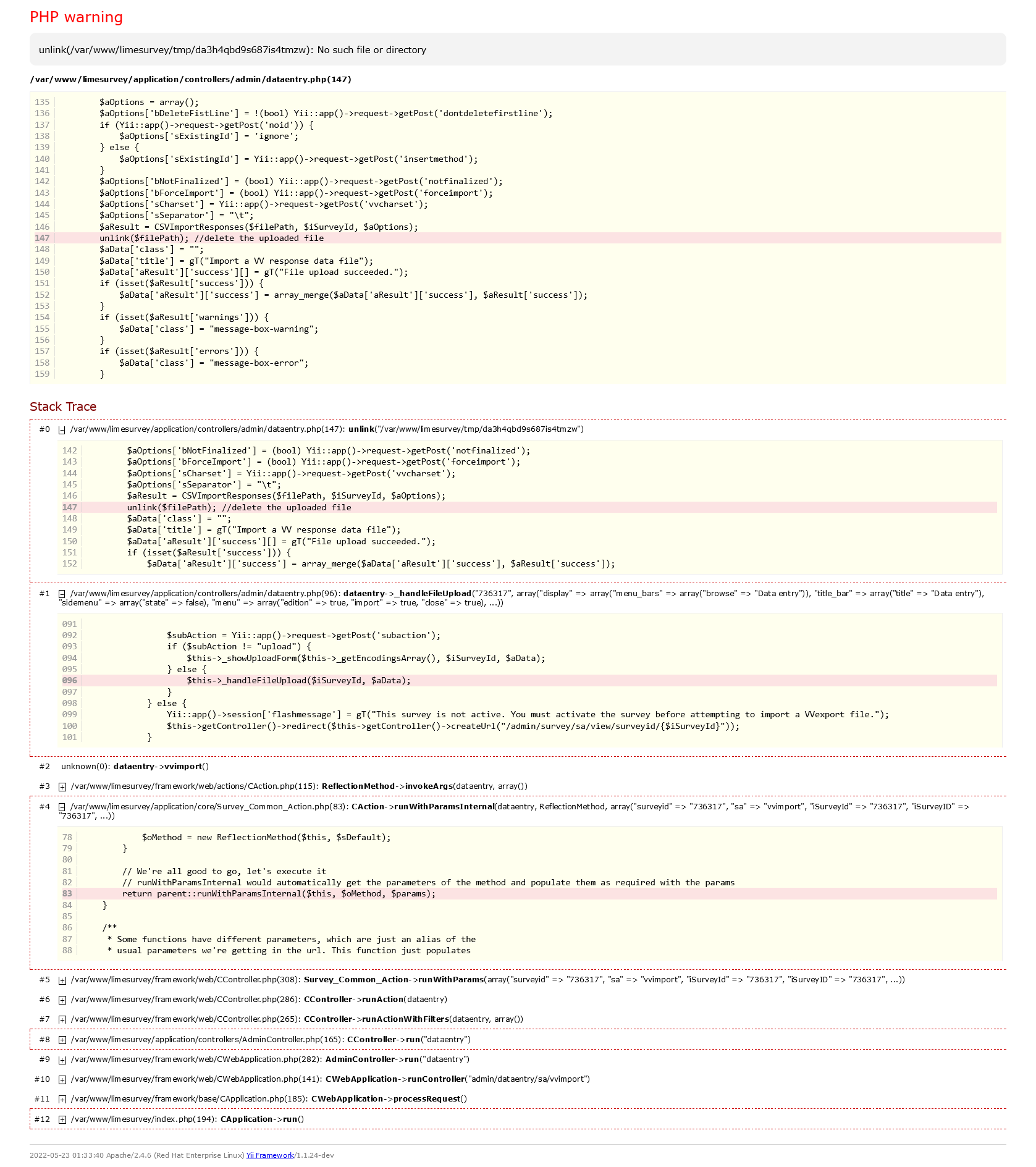 | Steps To Reproduce | Steps to reproduceCreate a sample survey with a sample group and quesiton. Activate and add a couple of responses. Export responses as vv file. Import said vv file Expected resultthe first two responses are replicated Actual resulti am shown an error messages. the first two responses are replicated, though unlink(/var/www/limesurvey/tmp/ha9x8ktjh5s42zyqjg77): No such file or directory /var/www/limesurvey/application/controllers/admin/dataentry.php(147) 135 $aOptions = array(); Stack Trace 142 $aOptions['bNotFinalized'] = (bool) Yii::app()->request->getPost('notfinalized'); #1 091 #2 78 $oMethod = new ReflectionMethod($this, $sDefault); #5 doesn't happen in v. 3.28.11 In which files is this fixed ? | ||||