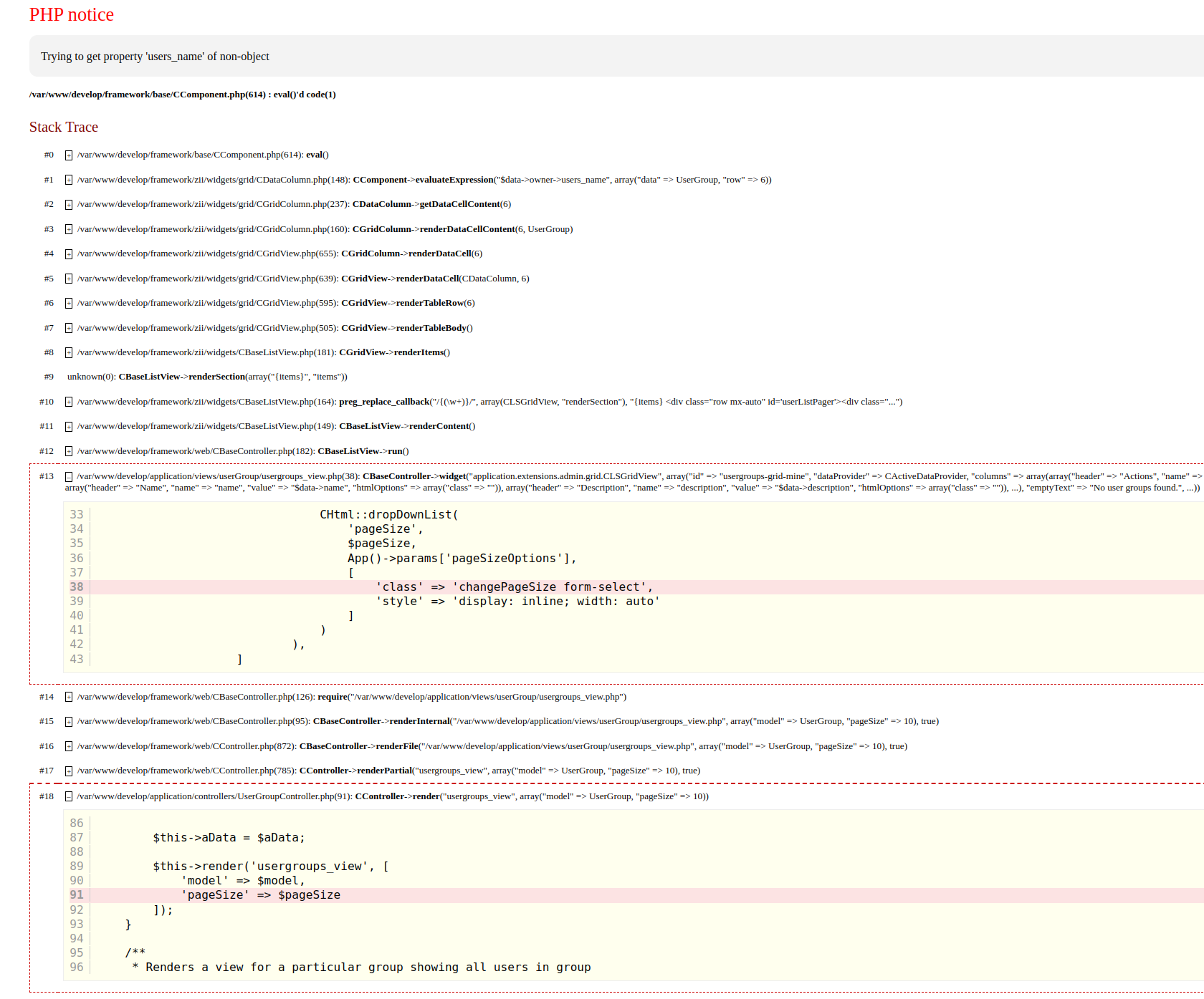 So the problem happens when you create a usergrp as a user and then delete the user, when you then go to the usergroups page the error is visible. The main problem is that the users dont get deleted at all from the tables "user_groups" and "user_in_groups". |