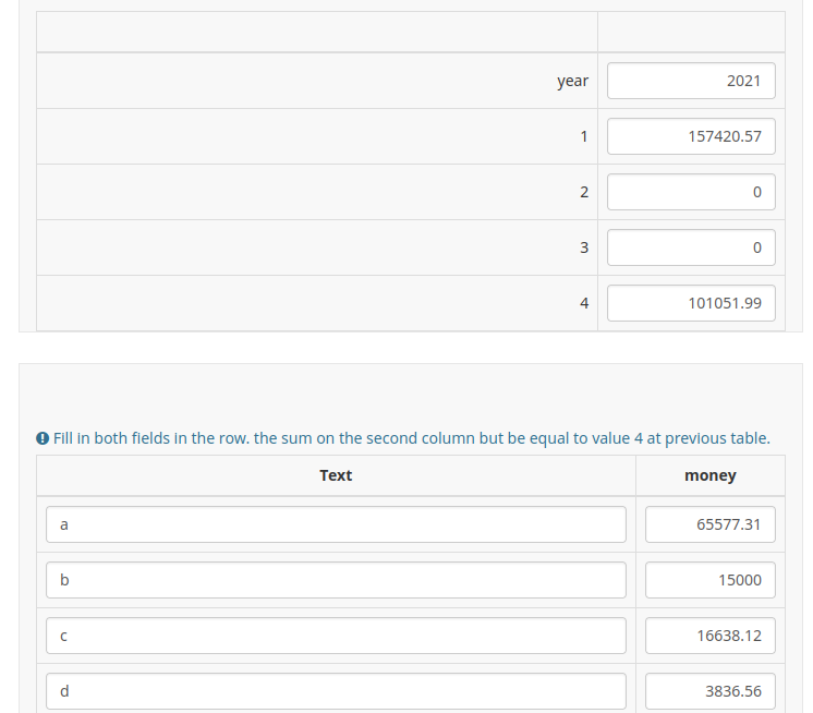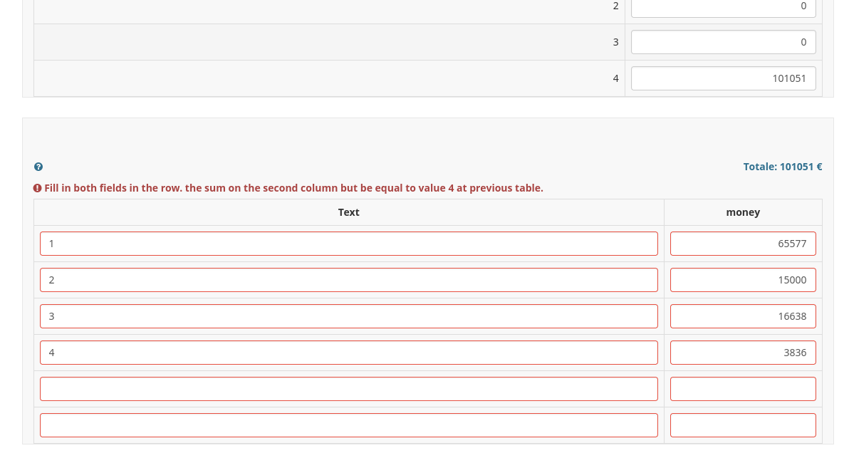 Hello Denis, sum(that.ALTR3.sq_IMP.NAOK) == SEZ62QC50_AltriFondi_Importo.NAOK still triggers the error but in the question text checked values: sum(that.ALTR3.sq_IMP.NAOK): 101051.99 true "true" and "1" are is_numeric() output on the value on the same line. |