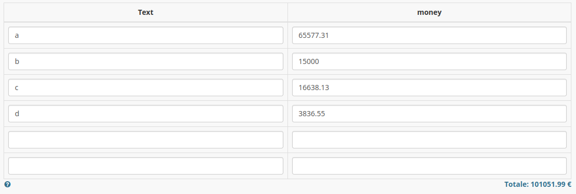 <help><![CDATA[<p style="text-align: right;"><strong>Totale: {(sum(that.ALTR3.sq_IMP.NAOK))} €</strong></p>
