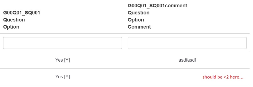 | Description | Question type "Multiple choice with comments" is not saving comments to the database (at least according to the Settings/Responses tab) if a comment string starts with a "<" symbol (e.g. <2). | ||||