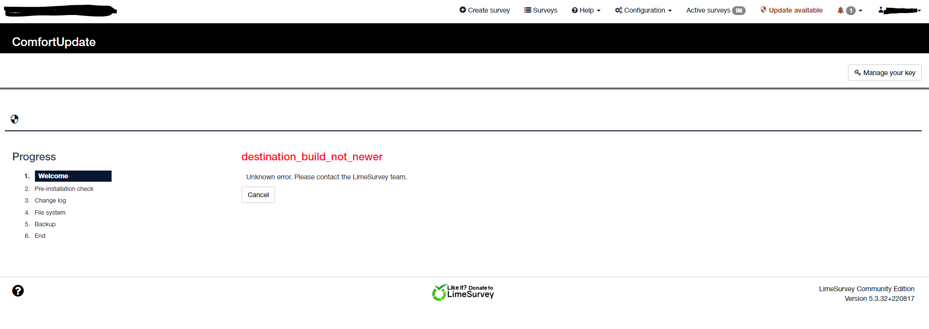 | Description | Tried to update from 5.3.32+220817 using comfort update to 5.4.0 Message on screen reads destination_build_not_newer | ||||