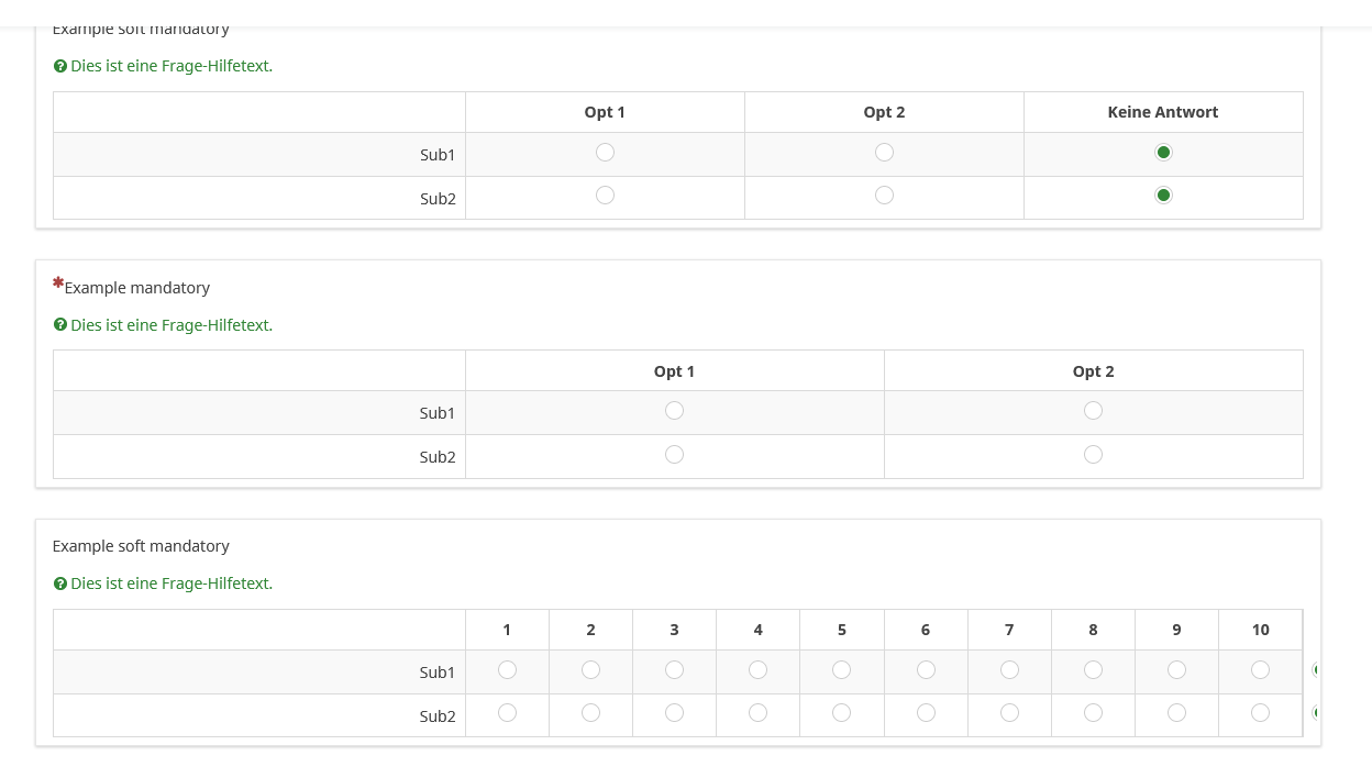 | Description | For certain question types (Matrix, type F; Matrix (10-point, type B), when choosing "soft mandatory", the automatically created "no answer" option is still shown (see screenshot). For the Matrix (10-point, type B) the behavior seems buggy, the radio buttons are outside the table, but still visible. Can anyone reproduce this issue? | ||||