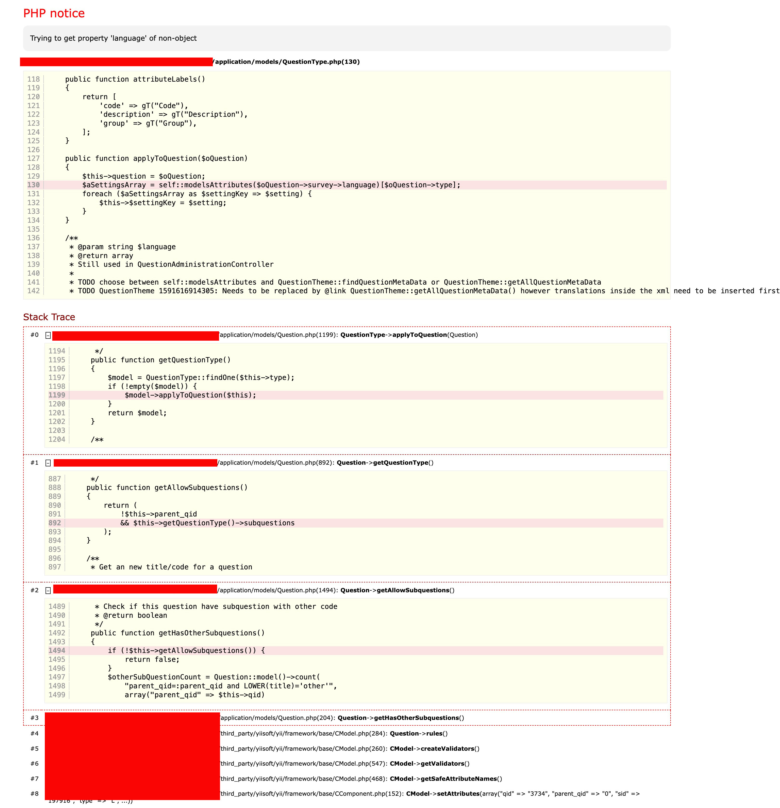 | Steps To Reproduce | Step 1: Step 2: Step 3: Step 4: Step 5: (Replace this text with detailed step-by-step instructions on how to reproduce the issue) Expected resultSurvey question copied Actual resultI get this error: "Trying to property 'language' of non-object" I'm attaching a screenshot of the actual error. | ||||