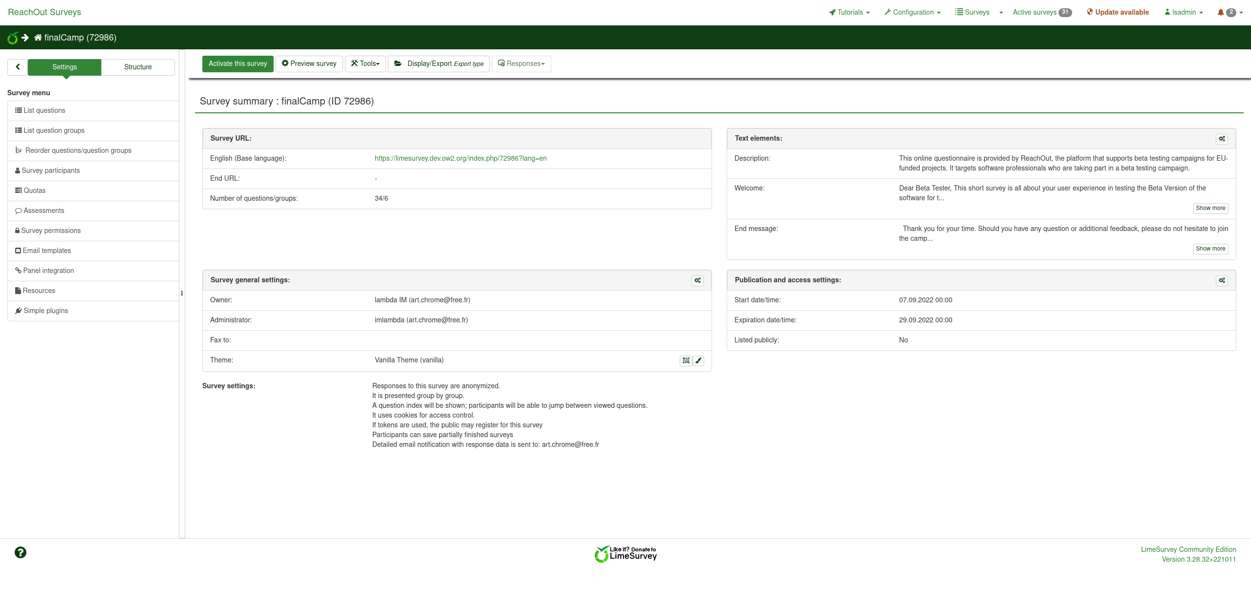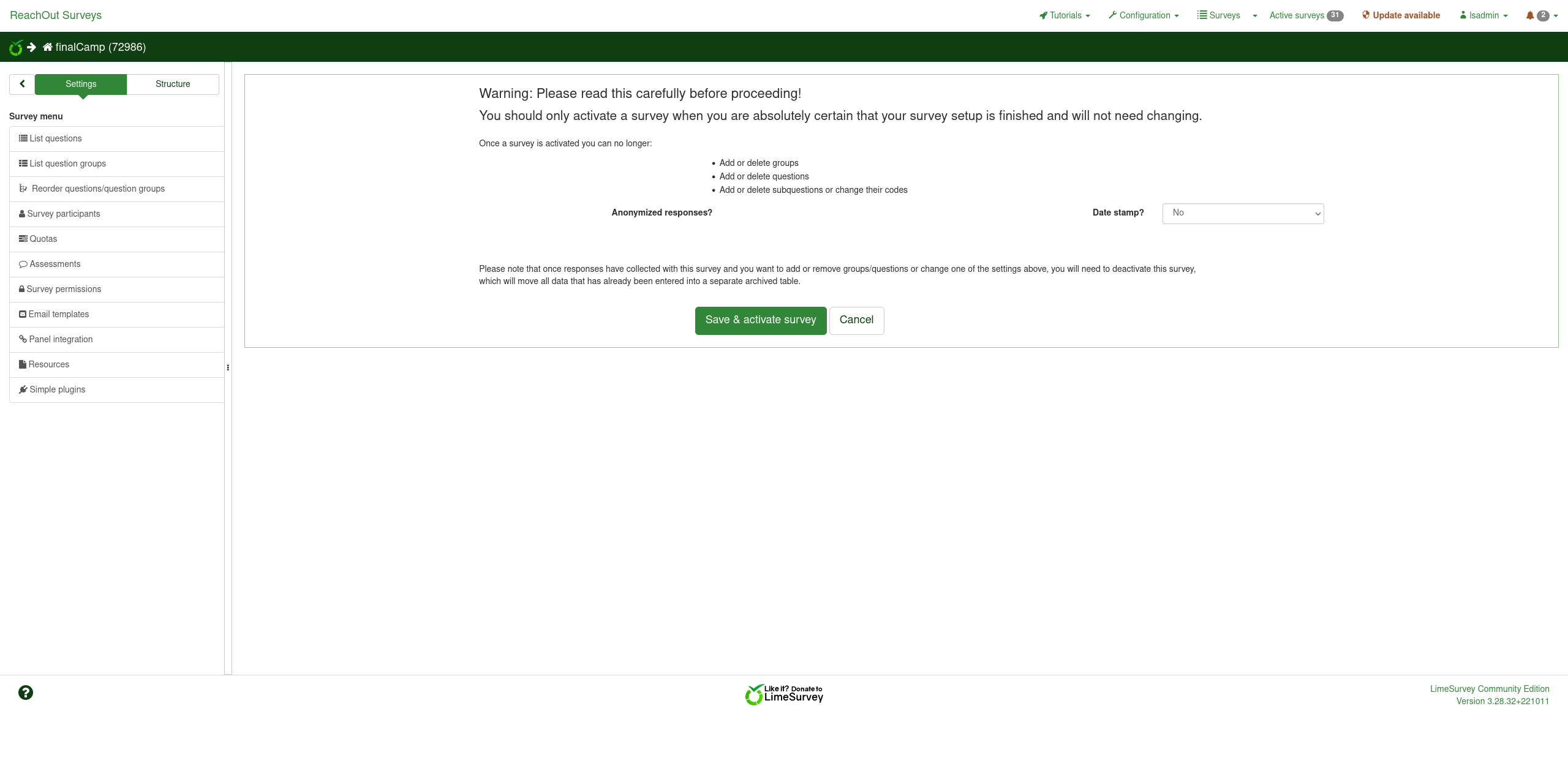 | Complete LimeSurvey version number (& build) | 3.28.32+221011 | ||||