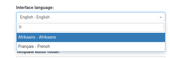 Fixed issue 18456: Interface language parmater use exotic dropdown list. (#3067) * Fixed issue 18456: Interface language parmater use exotic dropdown list. Class activate-search added to select. Select2 initialized manually. * Fixed issue 18456: Interface language parmater use exotic dropdown list. Bootstrap theme added to select2 select. * Fixed issue 18456: Interface language parmater use exotic dropdown list. Css classes added. * Fixed issue 18456: Interface language parmater use exotic dropdown list. Ready to merge. * Fixed issue 18456: Interface language parmater use exotic dropdown list. Class activate-search added so select2 is automatically initialized. --------- Co-authored-by: Lapiu Dev <devgit@lapiu.biz> |