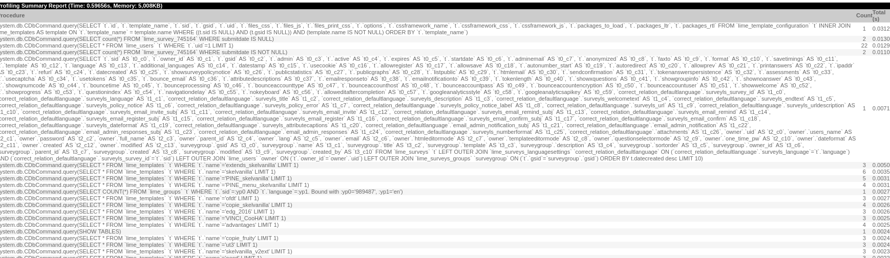 | Description | When goes to survey listing with SQLdebug set : we see multiple call of same rquest | ||||