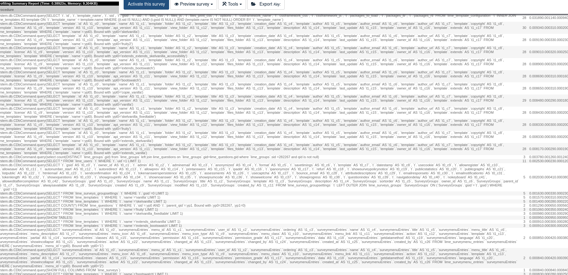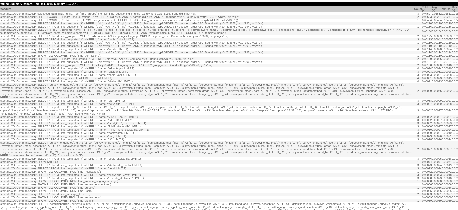 system.db.CDbCommand.query(select count(DISTINCT g.gid) from `lime_groups` g left join lime_questions q on g.gid=q.gid where g.sid=513678 and qid is not null) 3 0.04597 0.01532 0.01511 0.01547 system.db.CDbCommand.query(SELECT COUNT(*) FROM `lime_questions` `t` WHERE `t`.`sid`=:yp0 AND `t`.`parent_qid`=:yp1 AND `t`.`language`=:yp2. Bound with :yp0='513678', :yp1=0, :yp2='en') 2 0.00503 0.00251 0.00247 0.00256 system.db.CDbCommand.query(SELECT COUNT(DISTINCT `t`.`cid`) FROM `lime_conditions` `t` LEFT OUTER JOIN `lime_questions` `questions` ON (t.cqid = questions.qid) WHERE (sid =513678)) 1 0.00484 0.00484 0.00484 0.00484 system.db.CDbCommand.query(SELECT * FROM `lime_questions` `t` WHERE `t`.`sid`=:yp0 AND `t`.`gid`=:yp1 AND `t`.`language`=:yp2 ORDER BY question_order ASC. Bound with :yp0='513678', :yp1='993', :yp2='en') 1 0.00220 0.00220 0.00220 0.00220 system.db.CDbCommand.query(SELECT * FROM `lime_questions` `t` WHERE `t`.`sid`=:yp0 AND `t`.`gid`=:yp1 AND `t`.`language`=:yp2 ORDER BY question_order ASC. Bound with :yp0='513678', :yp1='994', :yp2='en') 1 0.00136 0.00136 0.00136 0.00136 system.db.CDbCommand.query(SELECT `t`.`id`, `t`.`template_name`, `t`.`sid`, `t`.`gsid`, `t`.`uid`, `t`.`files_css`, `t`.`files_js`, `t`.`files_print_css`, `t`.`options`, `t`.`cssframework_name`, `t`.`cssframework_css`, `t`.`cssframework_js`, `t`.`packages_to_load`, `t`.`packages_ltr`, `t`.`packages_rtl` FROM `lime_template_configuration` `t` INNER JOIN lime_templates AS template ON `t`.`template_name` = template.name WHERE ((t.sid IS NULL) AND (t.gsid IS NULL)) AND (template.name IS NOT NULL) ORDER BY `t`.`template_name`) 1 0.00134 0.00134 0.00134 0.00134 system.db.CDbCommand.query(SELECT * FROM `lime_groups` `t` WHERE sid=:surveyid AND language=:language ORDER BY group_order. Bound with :surveyid='513678', :language='en') 2 0.00125 0.00063 0.00063 0.00063 system.db.CDbCommand.query(SELECT * FROM `lime_templates` `t` WHERE `t`.`name`='copie_fruity' LIMIT 1) 3 0.00123 0.00041 0.00035 0.00046 system.db.CDbCommand.query(SELECT * FROM `lime_questions` `t` WHERE `t`.`sid`=:yp0 AND `t`.`gid`=:yp1 AND `t`.`language`=:yp2 ORDER BY question_order ASC. Bound with :yp0='513678', :yp1='992', :yp2='en') 1 0.00119 0.00119 0.00119 0.00119 system.db.CDbCommand.query(SELECT * FROM `lime_questions` `t` WHERE `t`.`sid`=:yp0 AND `t`.`gid`=:yp1 AND `t`.`language`=:yp2 ORDER BY question_order ASC. Bound with :yp0='513678', :yp1='991', :yp2='en') 1 0.00119 0.00119 0.00119 0.00119 system.db.CDbCommand.query(SELECT * FROM `lime_templates` `t` WHERE `t`.`name`='vanilla' LIMIT 1) 4 0.00114 0.00028 0.00024 0.00034 system.db.CDbCommand.query(SELECT * FROM `lime_questions` `t` WHERE `t`.`sid`=:yp0 AND `t`.`gid`=:yp1 AND `t`.`language`=:yp2 ORDER BY question_order ASC. Bound with :yp0='513678', :yp1='995', :yp2='en') 1 0.00114 0.00114 0.00114 0.00114 system.db.CDbCommand.query(SHOW FULL COLUMNS FROM `lime_permissions`) 1 0.00110 0.00110 0.00110 0.00110 system.db.CDbCommand.query(SELECT COUNT(*) FROM `lime_groups` `t` WHERE `t`.`sid`=:yp0 AND `t`.`language`=:yp1. Bound with :yp0='513678', :yp1='en') 2 0.00109 0.00055 0.00054 0.00056 system.db.CDbCommand.query(SELECT * FROM `lime_questions` `t` WHERE `t`.`sid`=:yp0 AND `t`.`gid`=:yp1 AND `t`.`language`=:yp2 ORDER BY question_order ASC. Bound with :yp0='513678', :yp1='996', :yp2='en') 1 0.00101 0.00101 0.00101 0.00101 system.db.CDbCommand.query(SELECT * FROM `lime_groups` `t` WHERE `t`.`sid`=:yp0 AND `t`.`language`=:yp1 ORDER BY group_order. Bound with :yp0=513678, :yp1='en') 2 0.00100 0.00050 0.00046 0.00054 system.db.CDbCommand.query(SELECT * FROM `lime_templates` `t` WHERE `t`.`name`='advantages' LIMIT 1) 4 0.00094 0.00024 0.00019 0.00031 system.db.CDbCommand.query(SELECT * FROM `lime_templates` `t` WHERE `t`.`name`='pasteur' LIMIT 1) 3 0.00093 0.00031 0.00028 0.00034 system.db.CDbCommand.query(SELECT * FROM `lime_templates` `t` WHERE `t`.`name`='copie_vanilla' LIMIT 1) 3 0.00093 0.00031 0.00028 0.00035 system.db.CDbCommand.query(SELECT * FROM `lime_users` `t` WHERE `t`.`uid`=1 LIMIT 1) 4 0.00091 0.00023 0.00015 0.00031 system.db.CDbCommand.query(SELECT * FROM `lime_templates` `t` WHERE `t`.`name`='skelvanilla' LIMIT 1) 4 0.00091 0.00023 0.00019 0.00027 system.db.CDbCommand.query(SELECT `surveymenuEntries`.`id` AS `t1_c0`, `surveymenuEntries`.`menu_id` AS `t1_c1`, `surveymenuEntries`.`user_id` AS `t1_c2`, `surveymenuEntries`.`ordering` AS `t1_c3`, `surveymenuEntries`.`name` AS `t1_c4`, `surveymenuEntries`.`title` AS `t1_c5`, `surveymenuEntries`.`menu_title` AS `t1_c6`, `surveymenuEntries`.`menu_description` AS `t1_c7`, `surveymenuEntries`.`menu_icon` AS `t1_c8`, `surveymenuEntries`.`menu_icon_type` AS `t1_c9`, `surveymenuEntries`.`menu_class` AS `t1_c10`, `surveymenuEntries`.`menu_link` AS `t1_c11`, `surveymenuEntries`.`action` AS `t1_c12`, `surveymenuEntries`.`template` AS `t1_c13`, `surveymenuEntries`.`partial` AS `t1_c14`, `surveymenuEntries`.`classes` AS `t1_c15`, `surveymenuEntries`.`permission` AS `t1_c16`, `surveymenuEntries`.`permission_grade` AS `t1_c17`, `surveymenuEntries`.`data` AS `t1_c18`, `surveymenuEntries`.`getdatamethod` AS `t1_c19`, `surveymenuEntries`.`language` AS `t1_c20`, `surveymenuEntries`.`showincollapse` AS `t1_c21`, `surveymenuEntries`.`active` AS `t1_c22`, `surveymenuEntries`.`changed_at` AS `t1_c23`, `surveymenuEntries`.`changed_by` AS `t1_c24`, `surveymenuEntries`.`created_at` AS `t1_c25`, `surveymenuEntries`.`created_by` AS `t1_c26` FROM `lime_surveymenu_entries` `surveymenuEntries` WHERE (`surveymenuEntries`.`menu_id`=:ypl0). Bound with :ypl0='1') 2 0.00089 0.00045 0.00032 0.00058 system.db.CDbCommand.query(SELECT * FROM `lime_templates` `t` WHERE `t`.`name`='ofdt' LIMIT 1) 3 0.00088 0.00029 0.00023 0.00037 system.db.CDbCommand.query(SELECT * FROM `lime_templates` `t` WHERE `t`.`name`='èè vanilla -- -ù' LIMIT 1) 3 0.00087 0.00029 0.00028 0.00030 system.db.CDbCommand.query(SELECT `template`.`id` AS `t1_c0`, `template`.`name` AS `t1_c1`, `template`.`fo