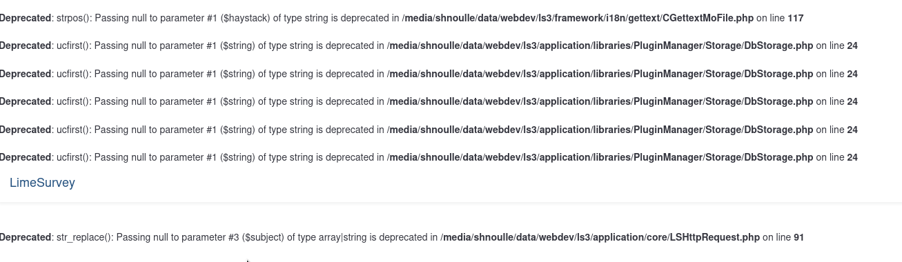 | Additional Information | In bug 17236 mentioned above, on May 10, 2021 there is a comment "Fix committed to 3.x-LTS branch: http://bugs.limesurvey.org/plugin.php?page=Source/view&id=31742". However, the link returns an error, as a bug with the id 31742 cannot be found. See also https://forums.limesurvey.org/forum/installation-a-update-issues/126589-php-8-and-ls-3-22-17 | ||||