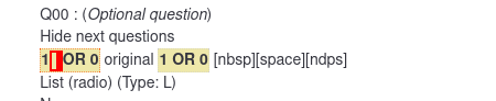| Steps To Reproduce | Steps to reproduceImport the attached survey. Expected resultThe condition looks normal but is not highlighted. The customer also reported that the survey behaves unexpected. Actual resultCondition is highlighted and probably not working correctly (latter one is hard to test because the survey is complex). | ||||