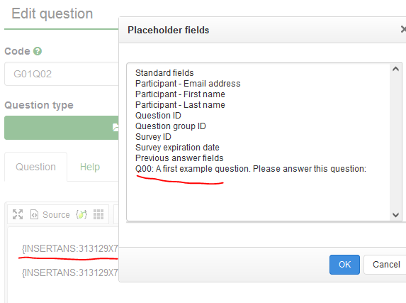 | Description | Placeholder inserts INSERTANS instead of questioncode. | ||||