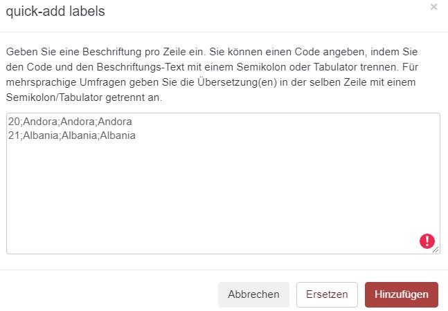 In German: Bitte speichern Sie die Frage, um die Antwortcodes auf die anderen Sprachen anzuwenden. Sie müssen die Fragen speichern, damit die Antwortcodes für die anderen Sprachen übernommen werden. |