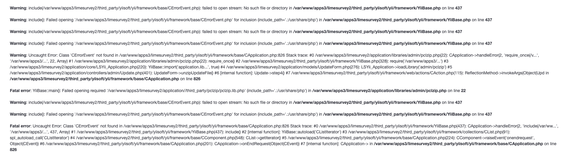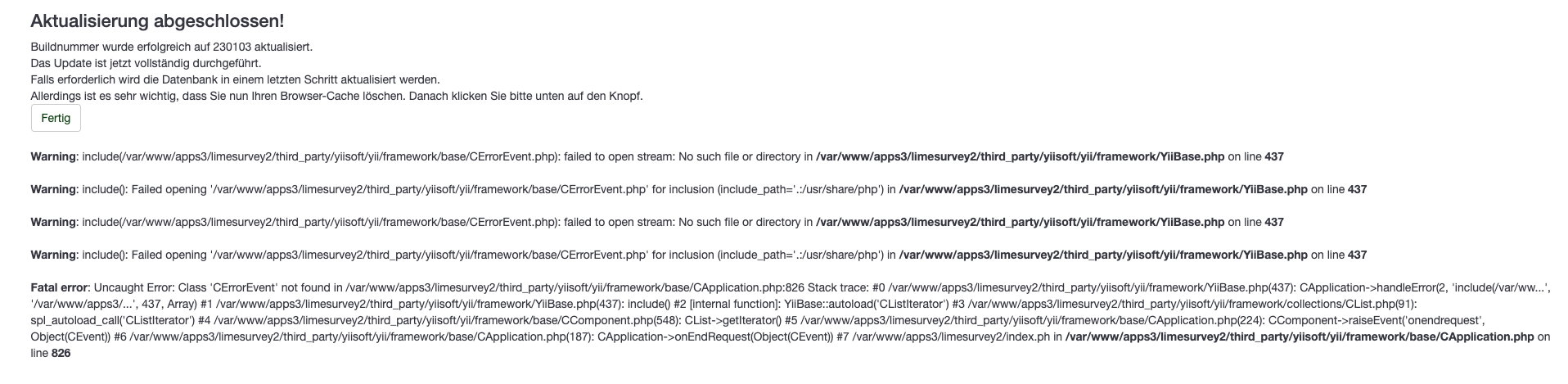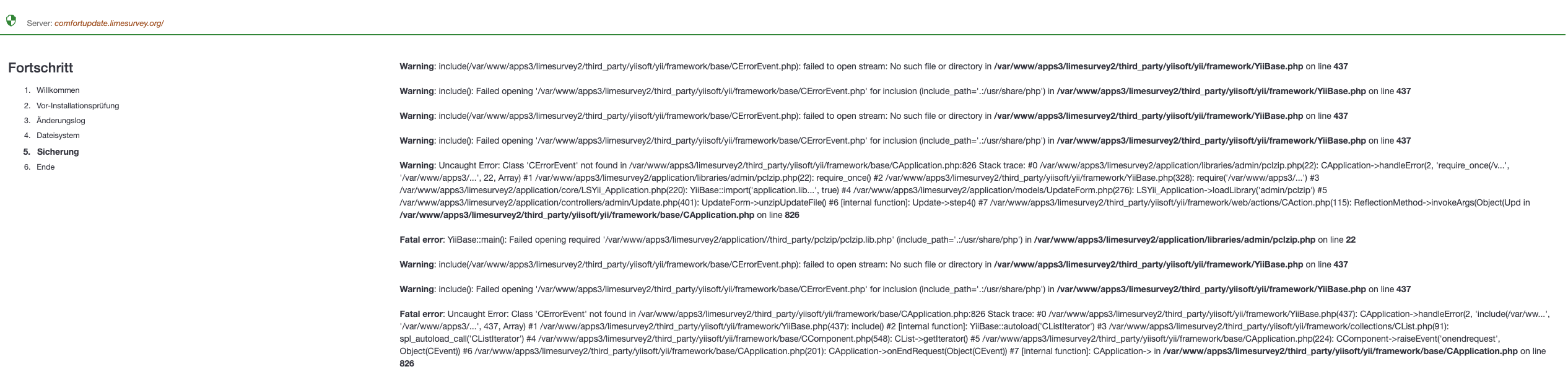 | Description | Hi, installing 5.5.0 via CU ends up in a message ("You have following problem with your update:" or likewise - but it does not show any error message). I saved the upgraded LS-folder and have access to the webserver logs. Let me know if I should look out for log entries you might need. Kind regards | ||||