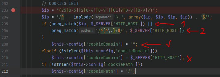 The value for the line marked with x in the image could be changed to empty string just as the condition before, but this would make the whole condition irrelevant since you could just always set $this->config['cookieDomain'] = ""; which sets the current domain as the cookie Domain, which is what we always want or is that a wrong assumption? | ||||