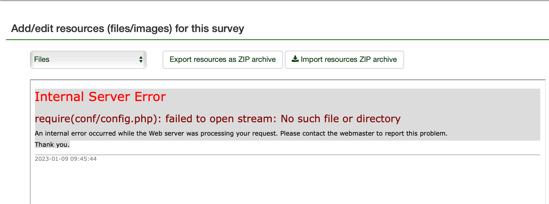 | Steps To Reproduce | Steps to reproduceClick on the item "Resources" of the left menu (Survey menu) Expected resultWindow with the list of files (Write here what you expected to happen) Actual resultInternal Server Error require(conf/config.php): failed to open stream: No such file or directory An internal error occurred while the Web server was processing your request. Please contact the webmaster to report this problem. | ||||