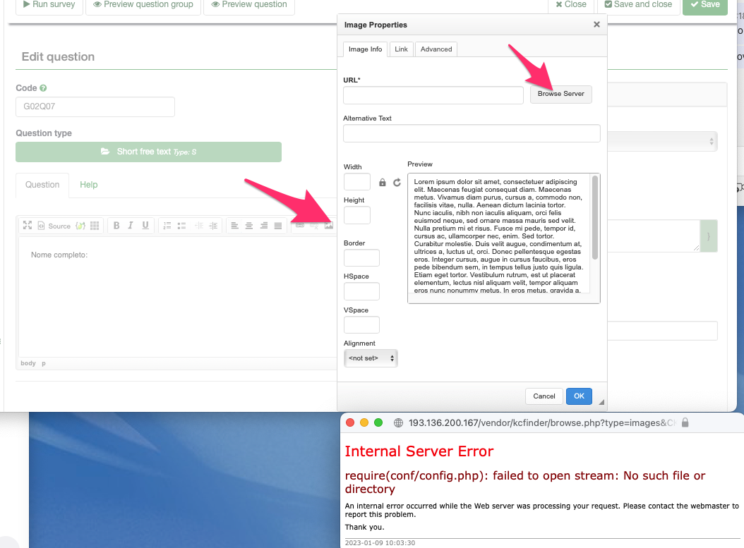 I also got this error when trying to add a image to a survey text element. The URL of the popup window is: |