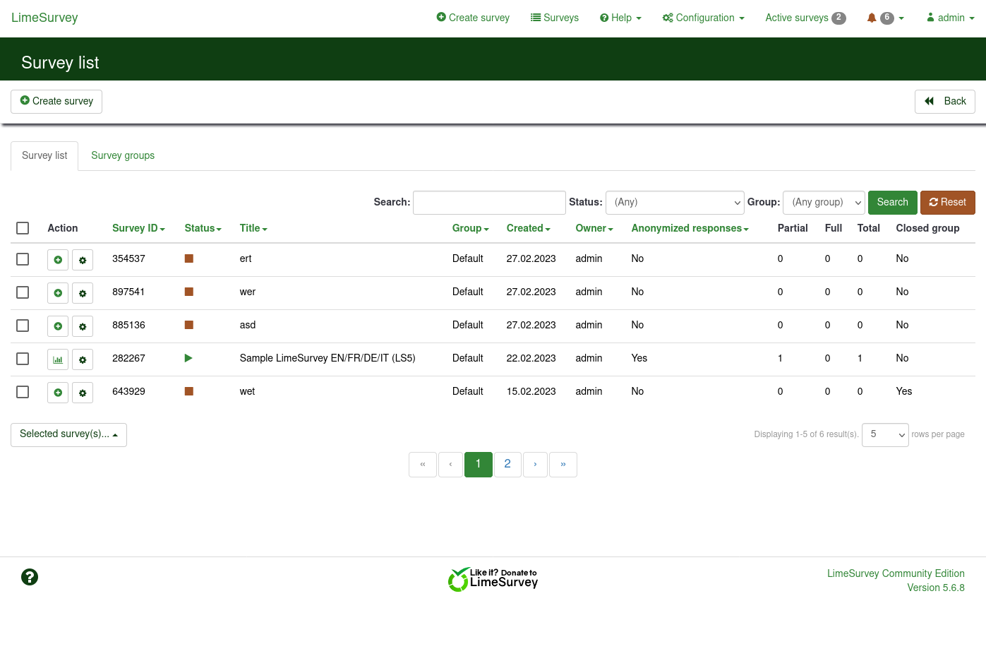 Expected resultshould load and display the surveys list on the current page like before Actual resulton the 7th click http500 error in a pop up window as described and the redirect to login screen more detailschecked on fresh install with fresh surveys as well as on a dumped db with 1.050 surveys with the same result. Checked on 5.6.0 and 5.6.3. | ||||
