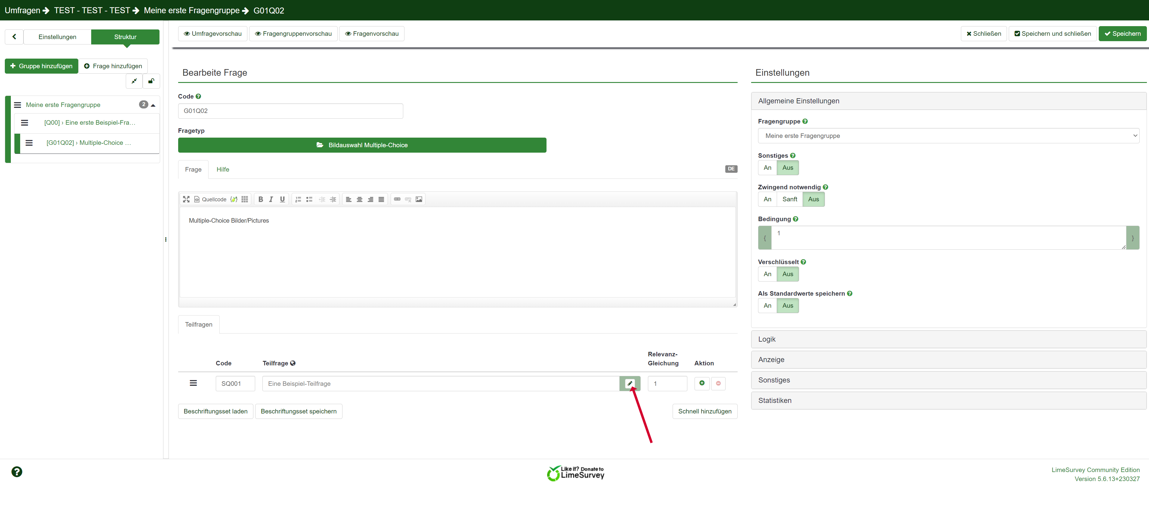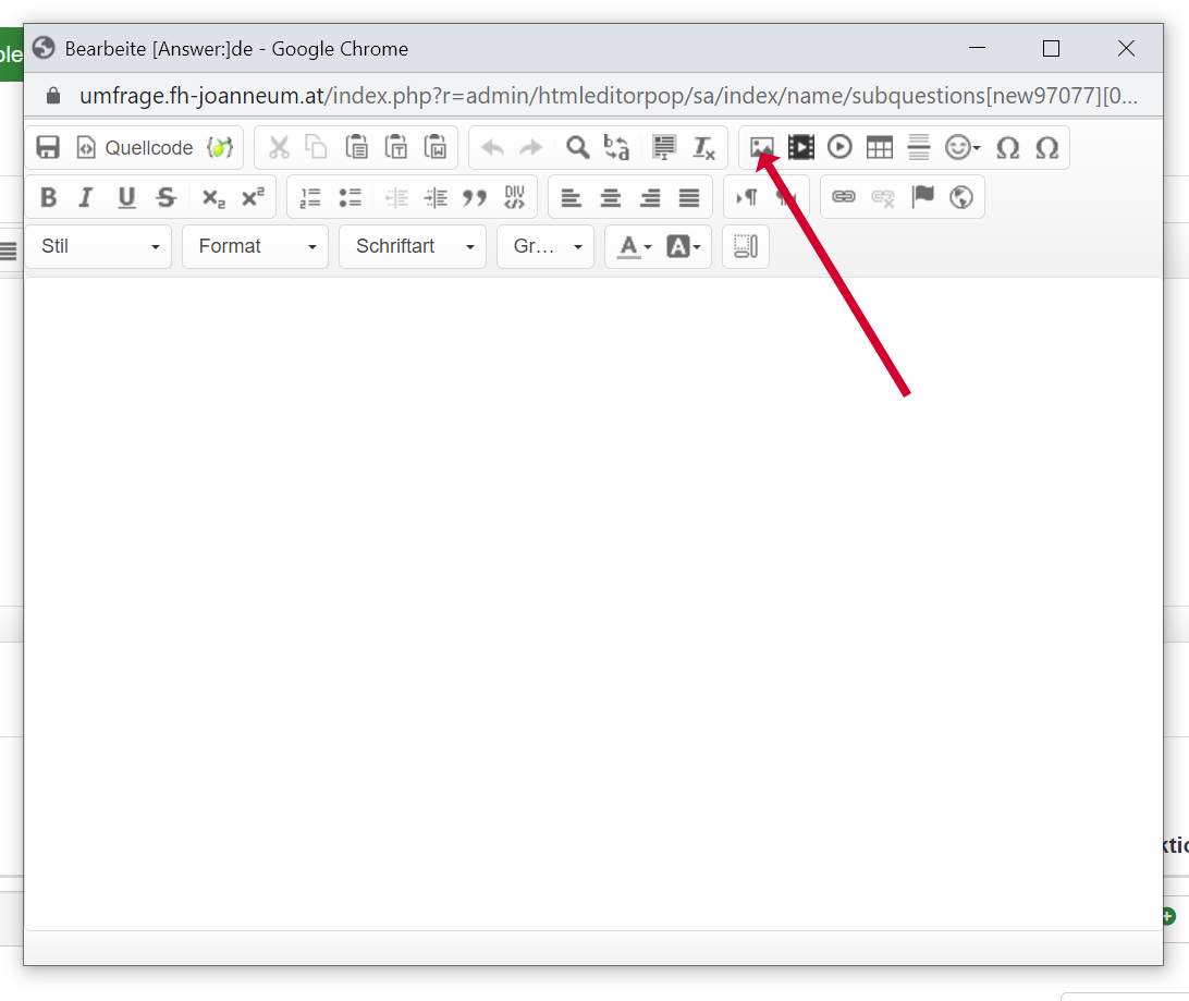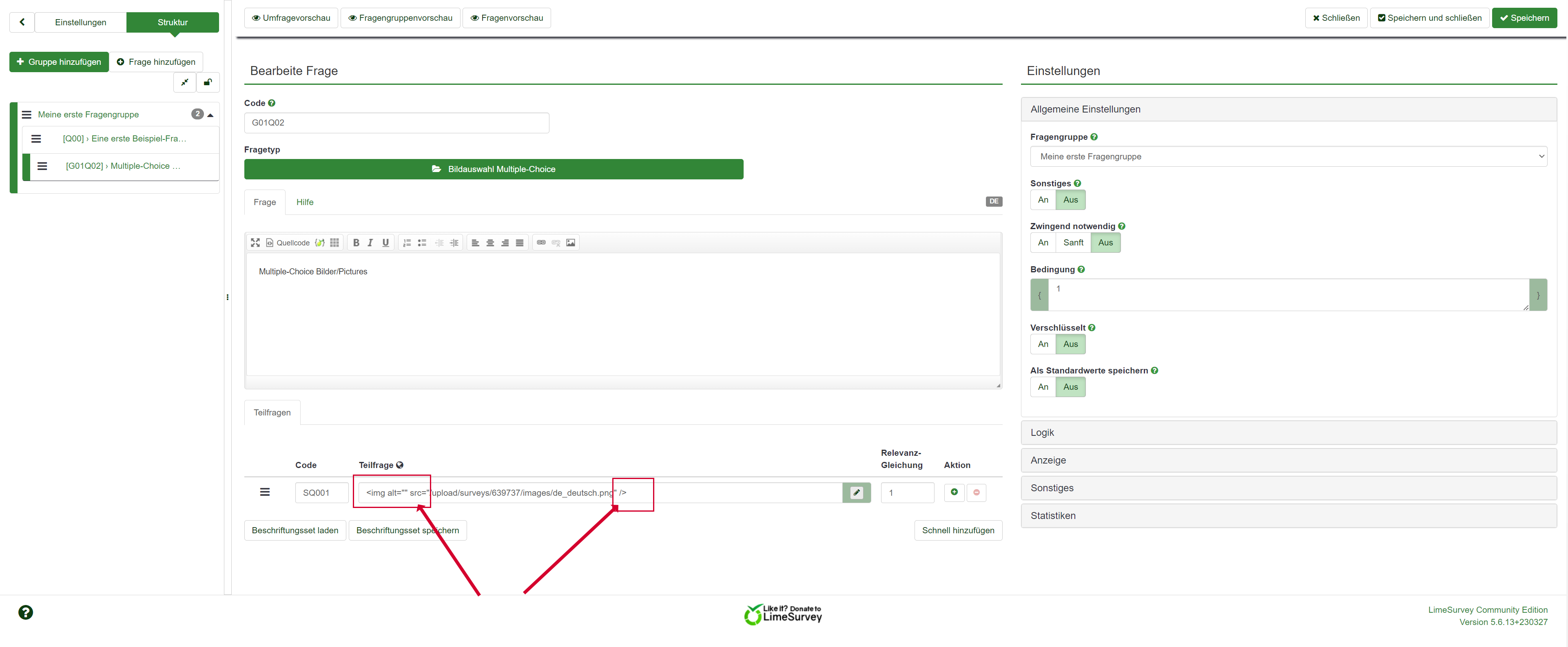 | Description | Hello! Example: First question has a picture in the question text successfully! Second question is "Pictures Multiple-Choice", but there is no picture and the link is correct in the editor, but no in the source code in survey (pre)view. Kind regards, Klaus | ||||
