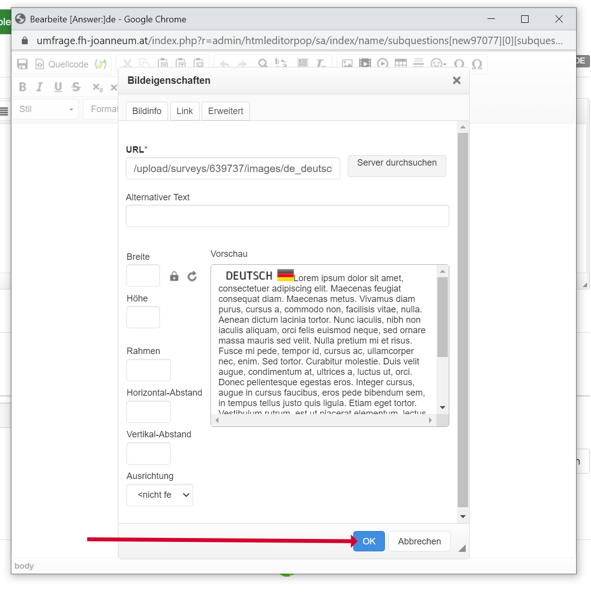 Here are all steps and clicks and at the end, you can see, that there is a html code in the field and that is a problem, because then the pictures don't show up and you have to delete the code before and after the path for every single picture. |