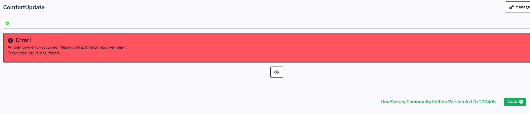 | Summary | 18727: Lime Survey 6.0.0 error build_not_found under Configuration->Comfort Update | ||||
