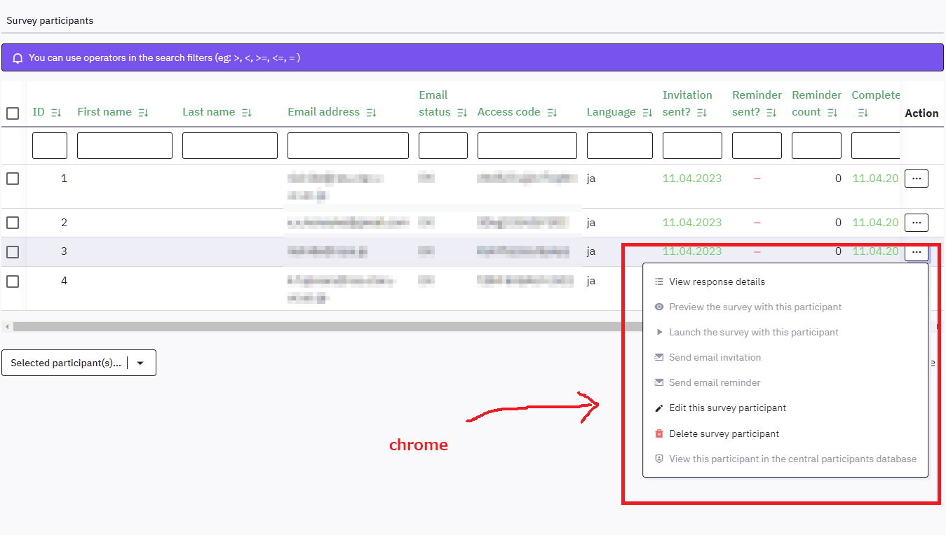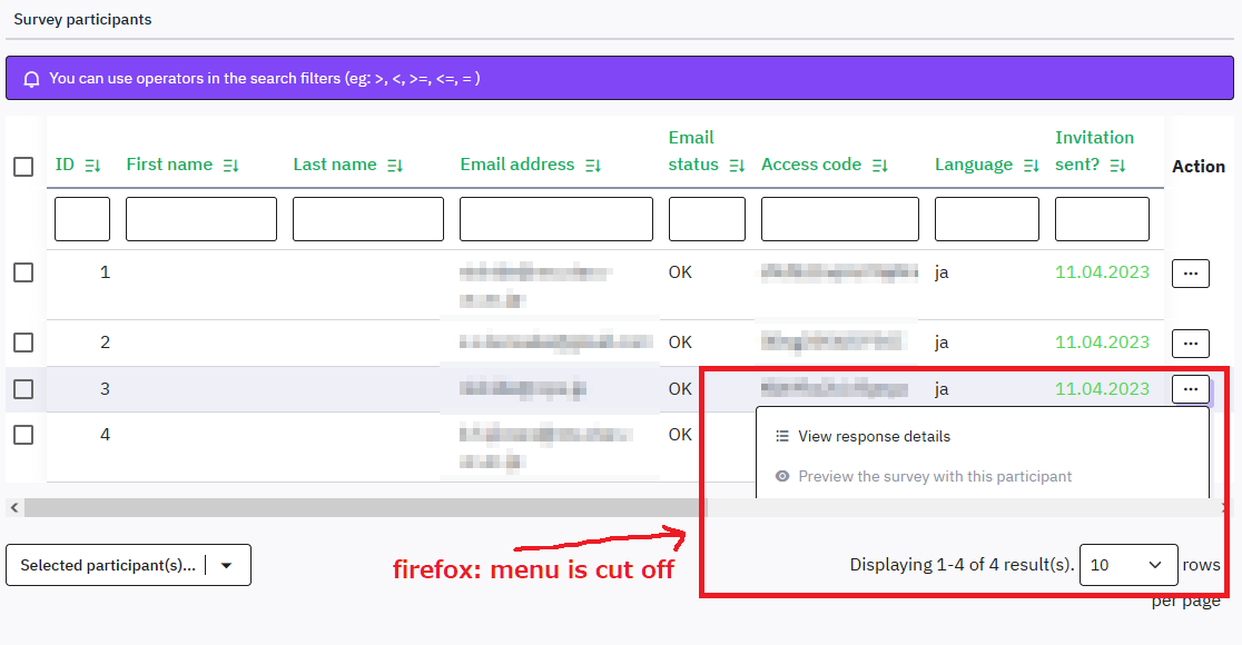 | Steps To Reproduce | Steps to reproduceA survey > Settings > Survey participants > Display partipants press any "Action" button for particpants Expected resultMenu window appears in the front. Actual resultPart of the menu window is cut off. | ||||