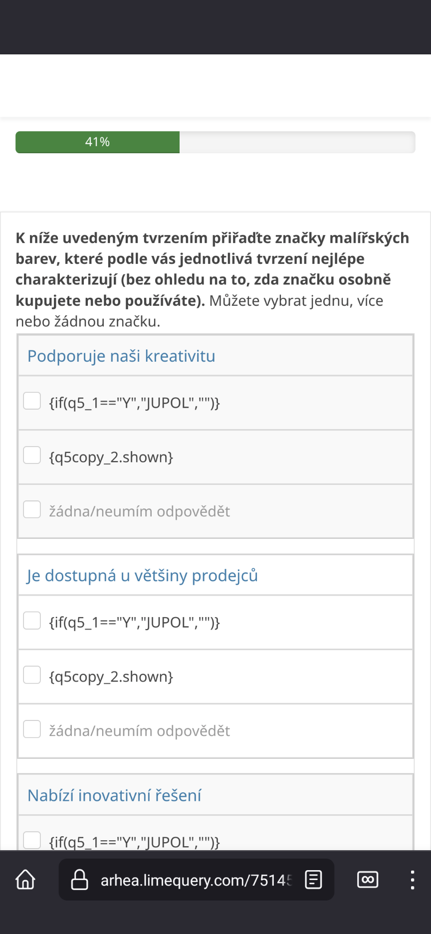 | Steps To Reproduce | Steps to reproduceCreate a multiple choice question (e.g. Q1), with answers 1: "a", 2: "b", 3: "c" Expected resultWhen marked answers on Q1 are "a", "b", or "c", those labels should be displayed as x-scale labels on Q2. Actual resultInstead when doing a survey on a mobile phone the x-scale labels are not displayed as "a", "b", "c", but as formulas - 1: "{if(q1_1.shown)}",2: "{if(q1_2.shown)}",3: "{if(q1_3.shown)}" etcd. | ||||