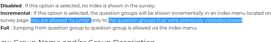 https://manual.limesurvey.org/Presentation#Show_Question_Index_.2F_Allow_Jumping And for allow backward : The sentencr saying : if you enable index : user can move to previous group Incremental : If this option is selected, the question groups will be shown incrementally in an index menu located on the survey page. You are allowed "to jump" only to the question groups that were previously visited/accessed; |