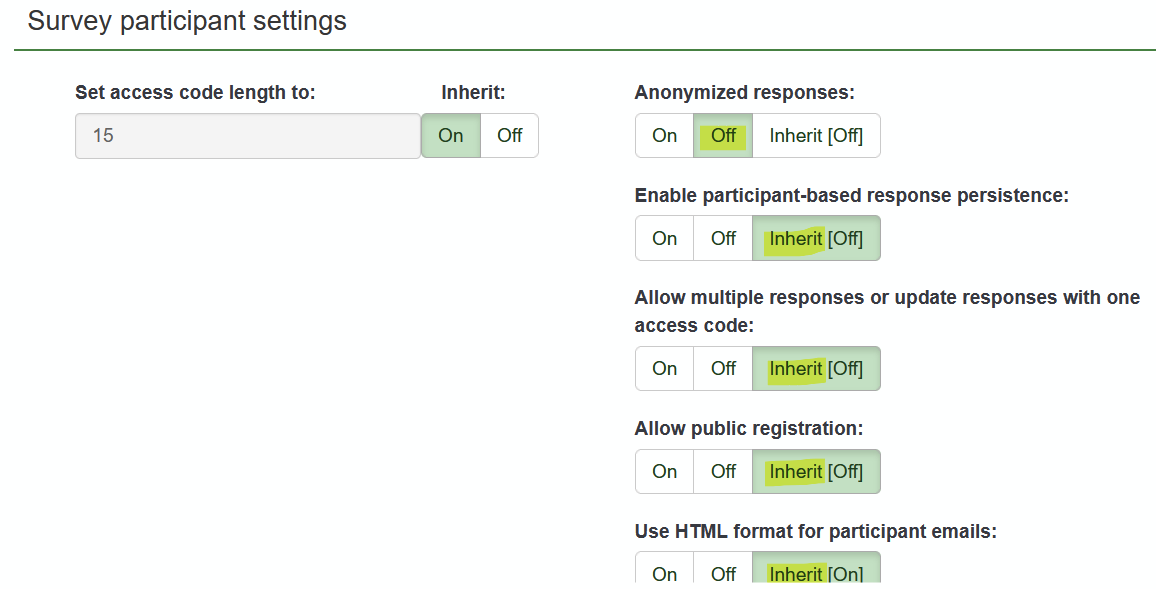 | Steps To Reproduce | Steps to reproduceCreate new survey. Check participant settings. Expected resultSetting for "anonymized responses" set to "inherited". Actual resultSetting is set to "off". | ||||