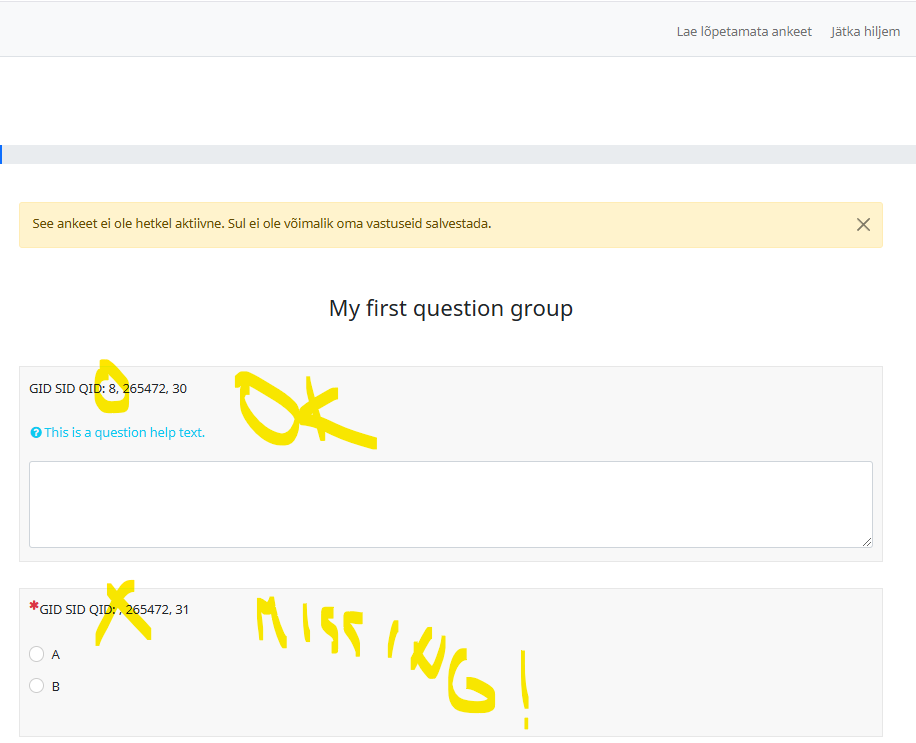 | Description | {GID} is not accessible in Question text and Help text if the following conditions are met: 1) the survey end_url contains a replacementVariable inside an EM function. For example: {if(1==1,'https://example.com/{SID}', 'https://example-two.com/{SID}')} and | ||||