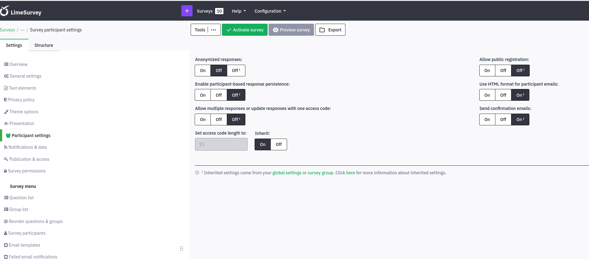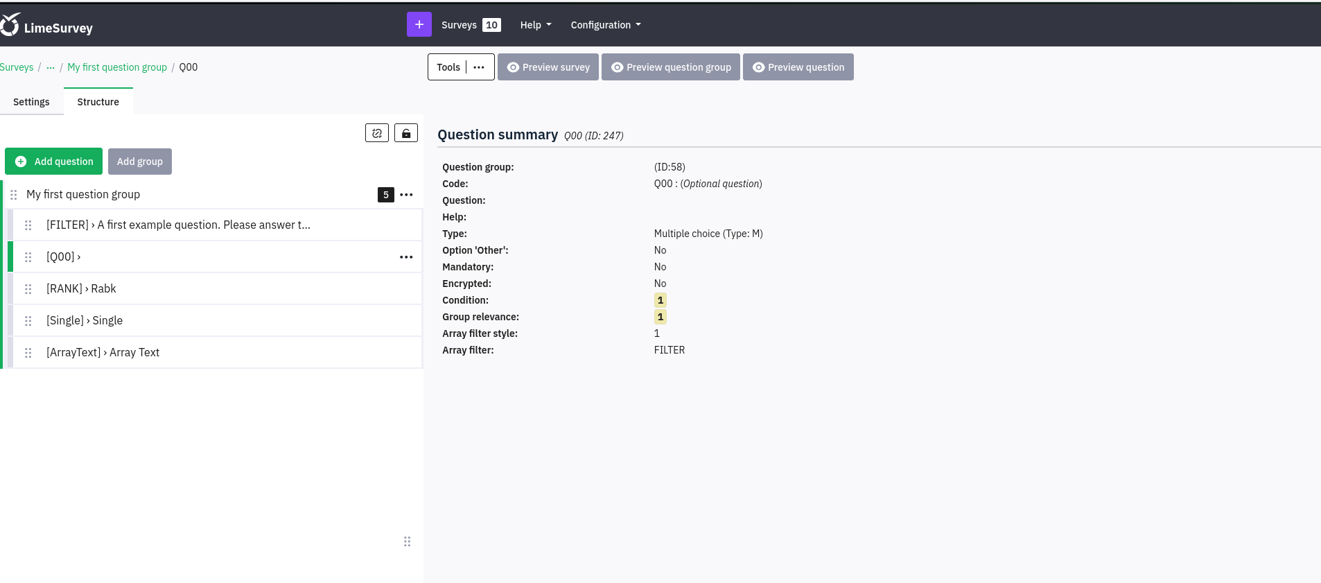 | Description | There are no information on current survey when editing settings, questions or group | ||||