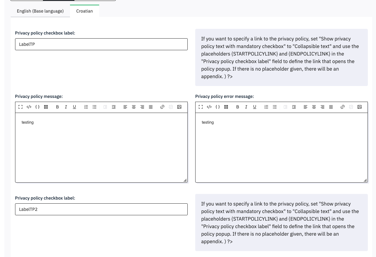 | Steps To Reproduce | Steps to reproduceCreate a multi language survey Expected resultEach policy in ints own tab Actual resultAll polciies stacked up | ||||